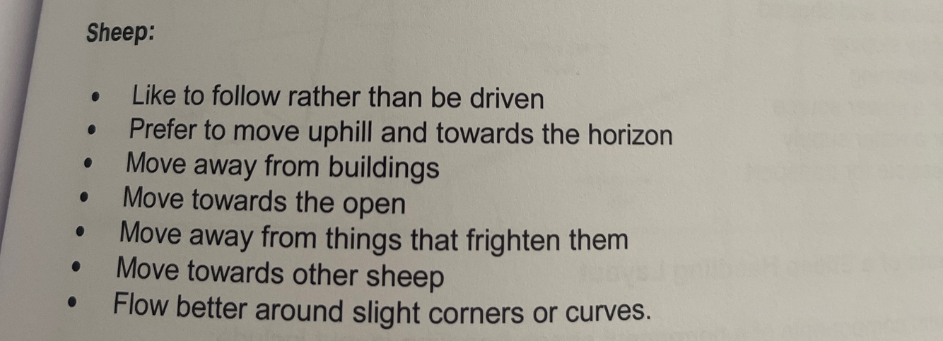 When designing a new handling unit, it is important to take the natural instincts of sheep into consideration. List 3 natural instincts you could use to help a new sheep handling unit.