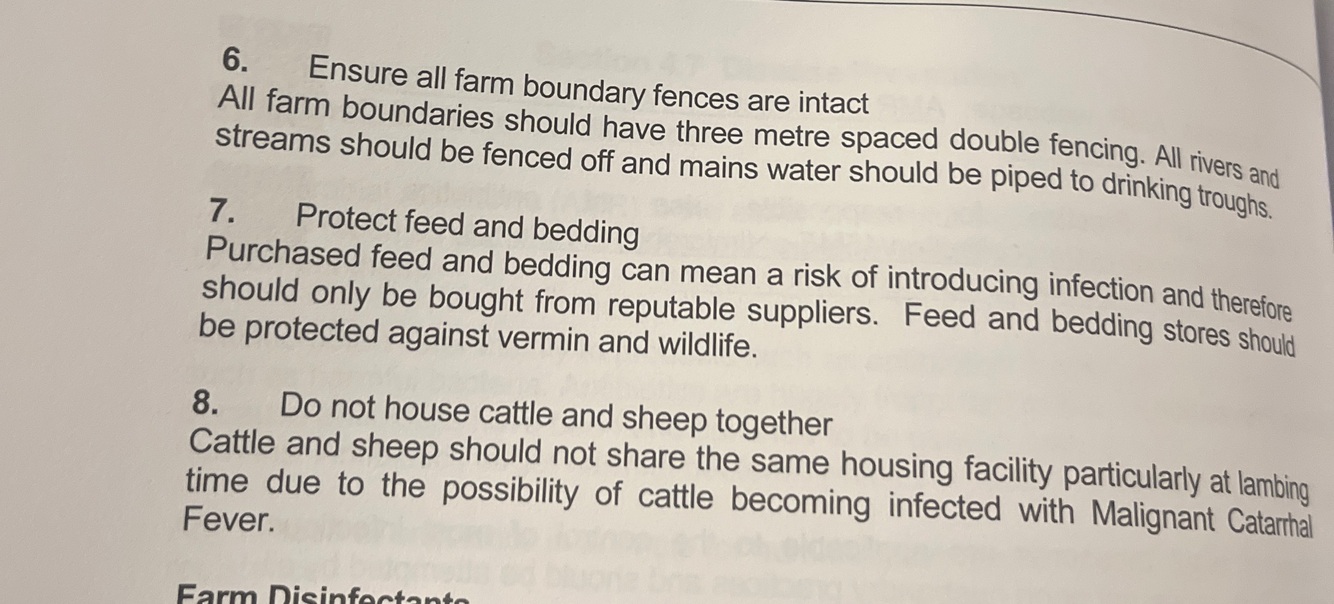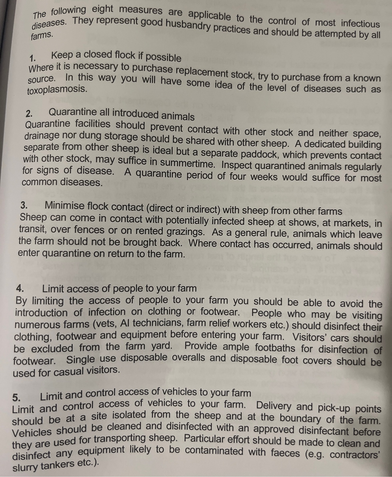 List and explain 5 bio-security measures that could be implemented on a sheep farm to control the introduction of disease.