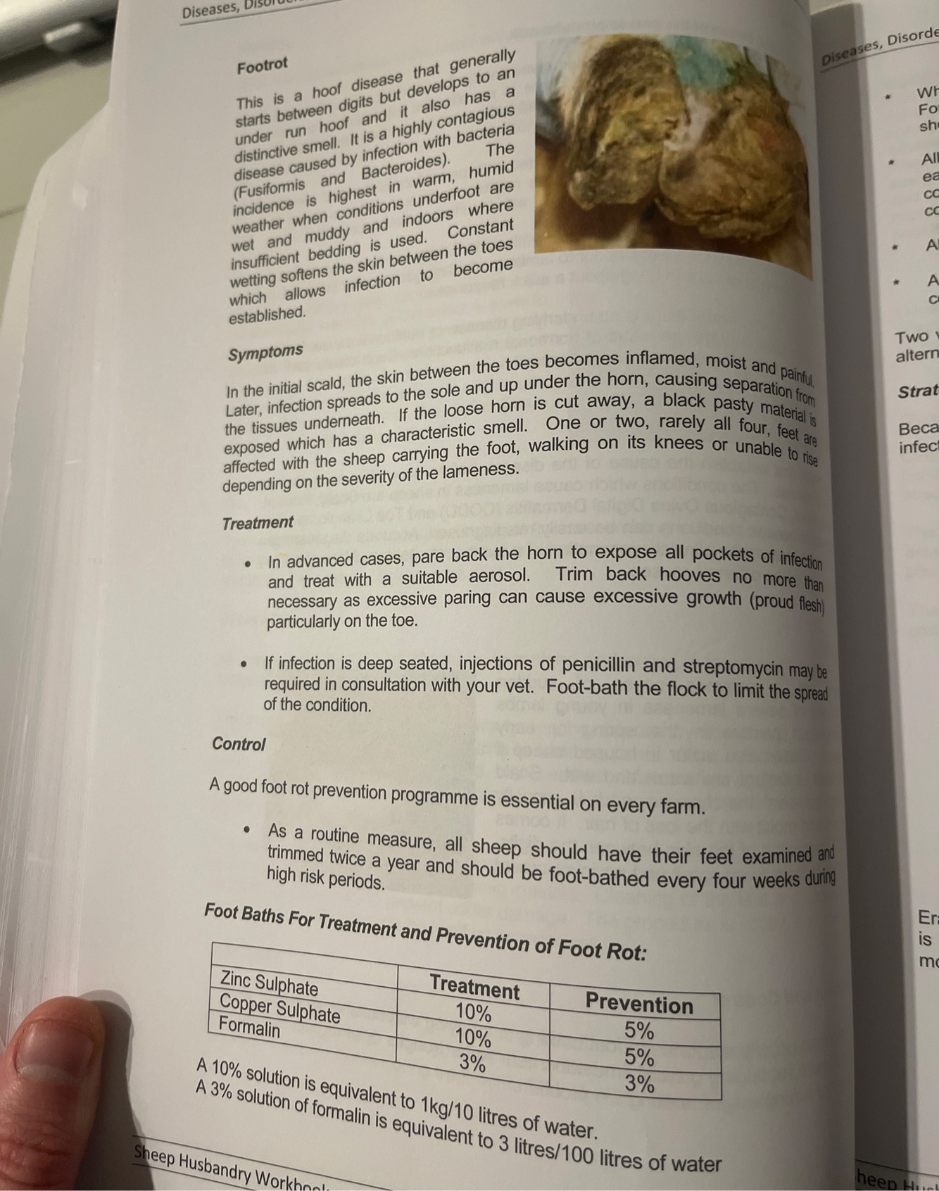 Outline the symptoms associated with footrot and advise how you would plan to treat footrot in a ewe in the first instance.