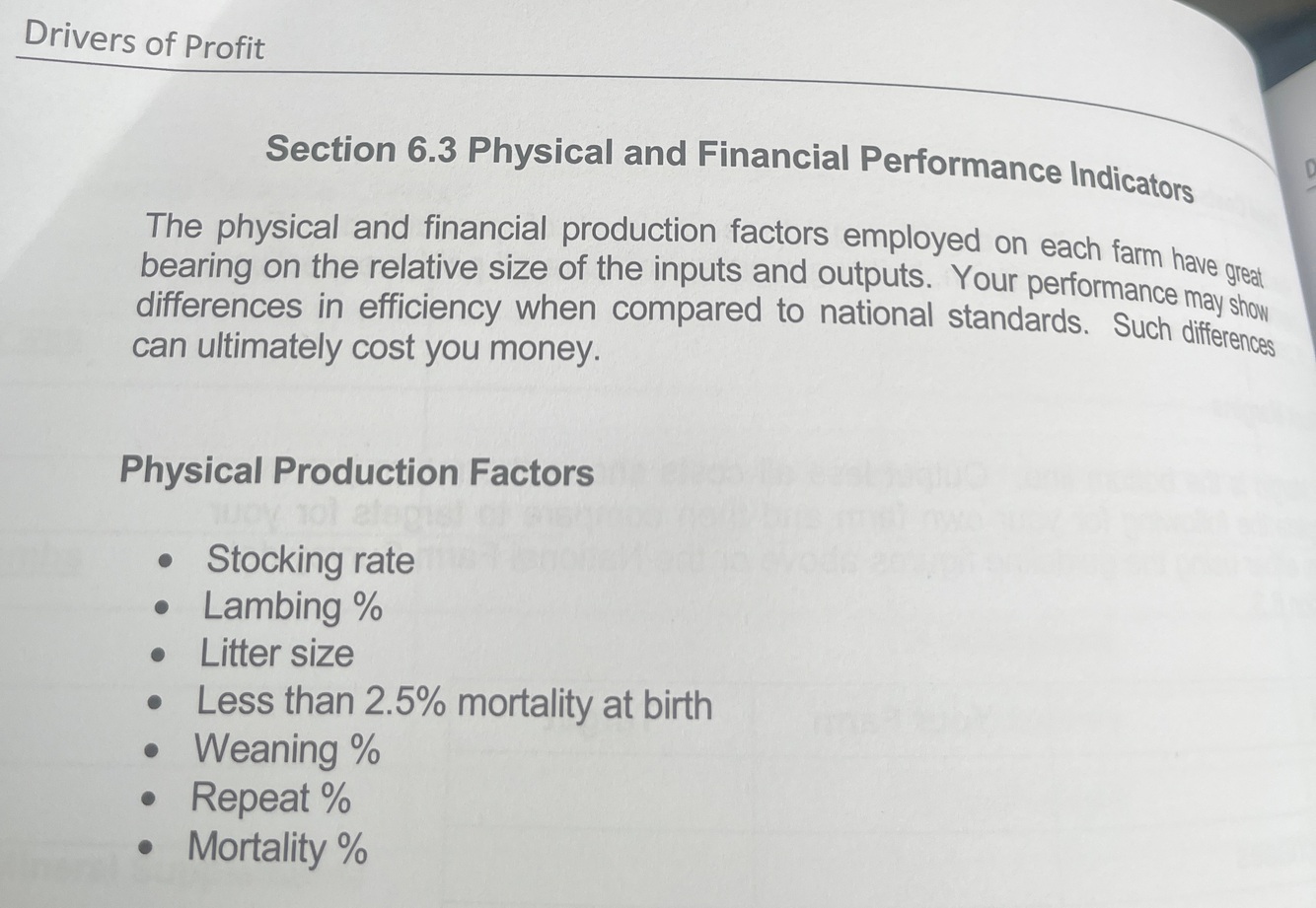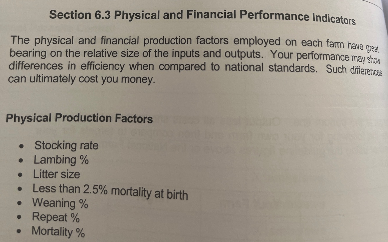The physical performance of your sheep flock plays a critical role in determining whether you make a profit or a loss on your sheep enterprise. Discuss in detail any 5 physical performance indicators and explain how a farmer could improve them to reach industry targets.