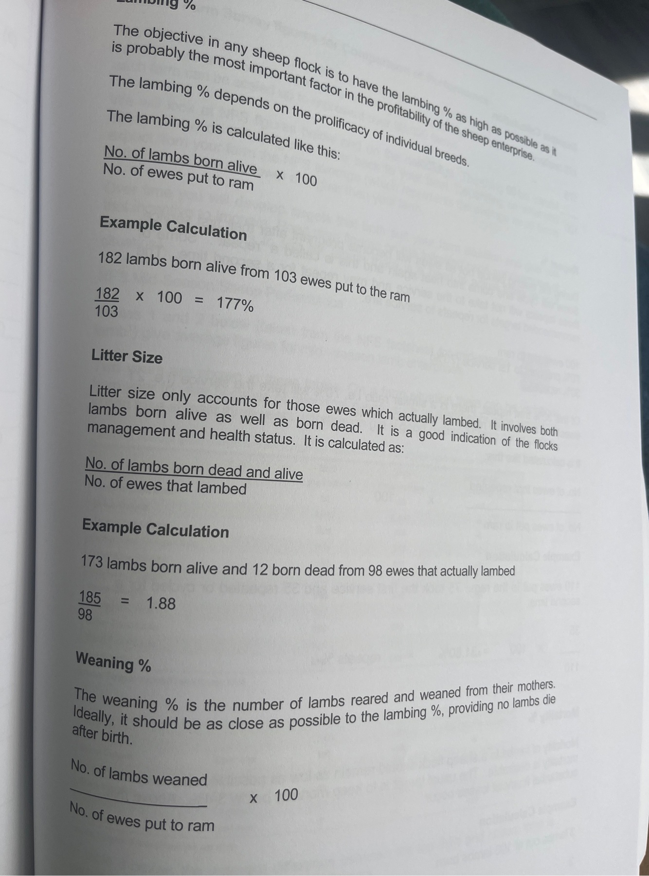 Understand and be able to work out the Litter size - Lambing % - Weaning % - Mortality % with given figures in the exam.