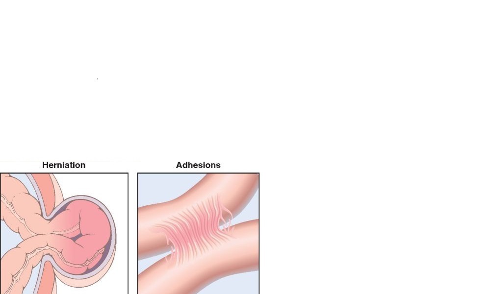 Collectively, hernias, intestinal adhesions,