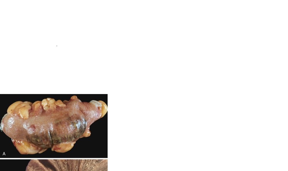 The resultant stasis and edema increase the bulk of the herniated loop, leading to permanent entrapment, or incarceration, and, over time, arterial and venous compromise (strangulation) develops that can result in infarction ( Fig. 17-23A ).