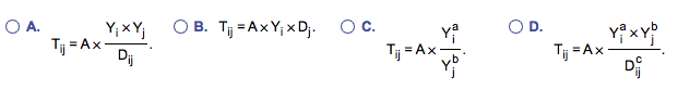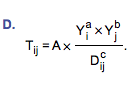 Mexico and Brazil have very different trading patterns. Mexico trades mainly with the United States and Brazil trades about equally with the United States and with the European Union. Mexico does much more trade relative to its GDP. These differences can be explained via the gravity model. Which of the following equations is the most general form of the gravity model?