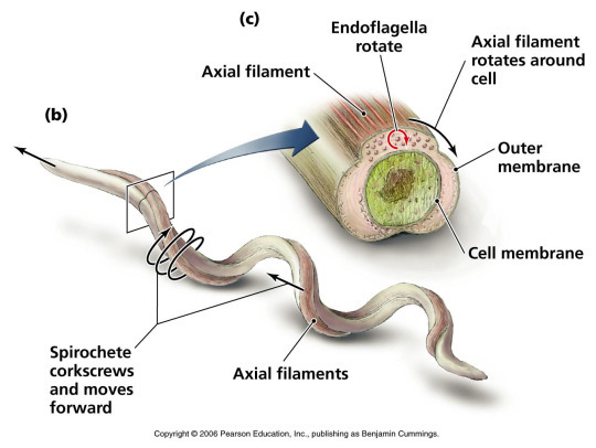 Given spriochetes particular spiral, intertwined cells, they move by the means of axial filaments (also called endoflagella) which are bundles of fibrils that arise at the ends of the cell beneath an outer sheath and spiral around the cell