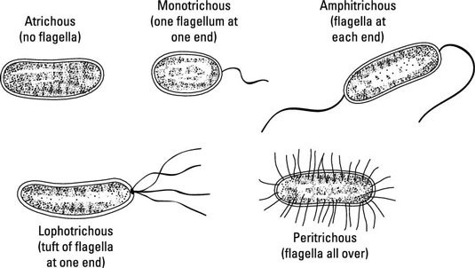 Atrichous/Peritrichous/Polar/Monotrichous/Lophotrichous/Amphitrichous