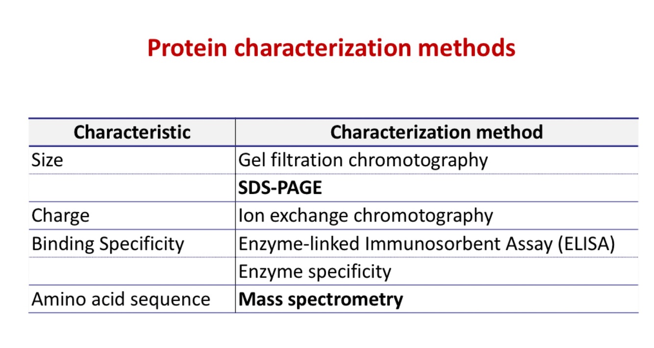 What are the four characteristics to look at for protein characterization? What are the characterization methods for each characteristic?