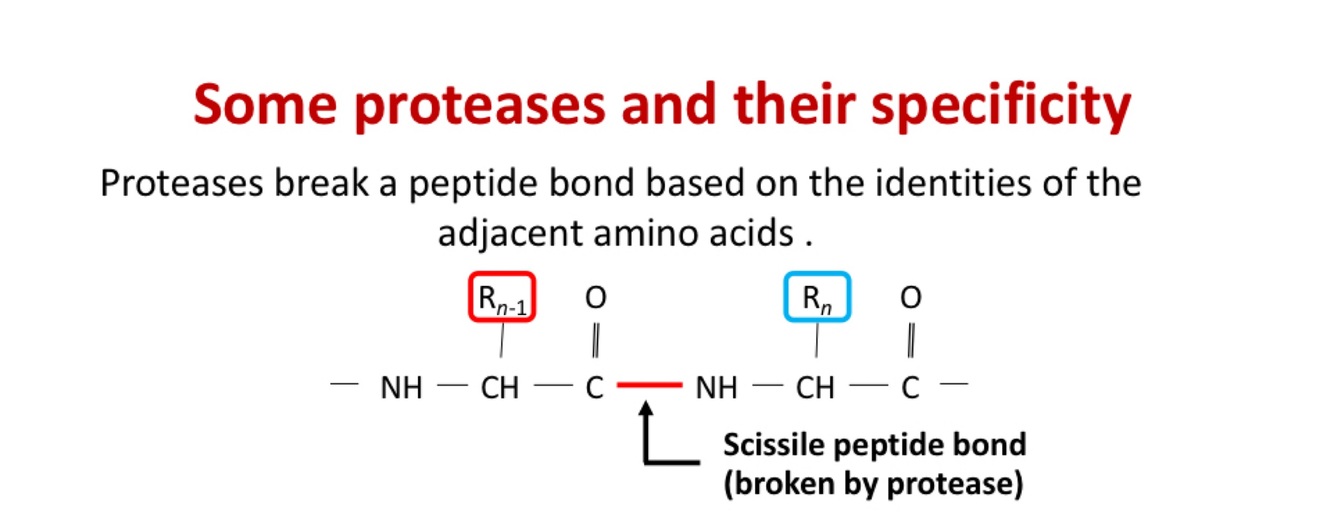 Proteases break a peptide bond based on the identities of the adjacent amino acids. (They break proteins)