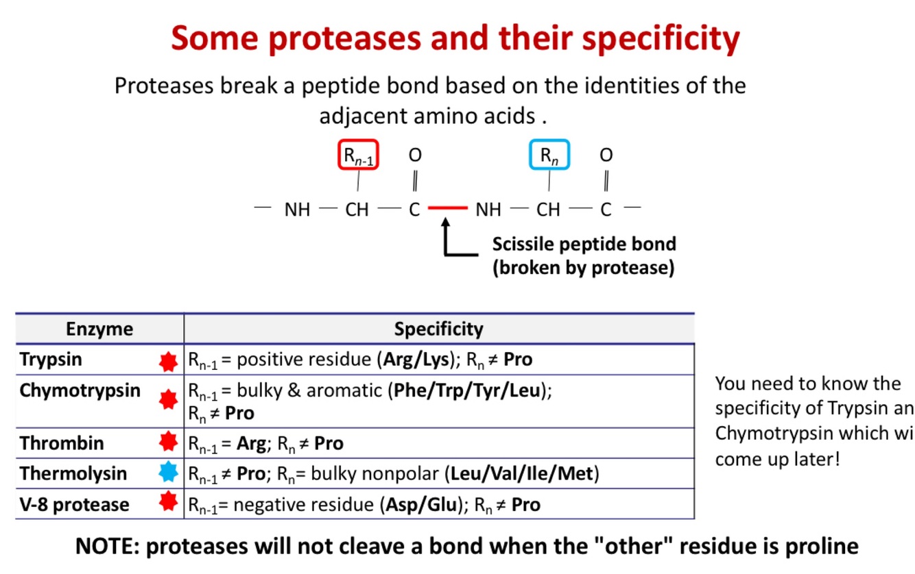 Exception: proteases will not cleave a bond when the “other” residue is proline.