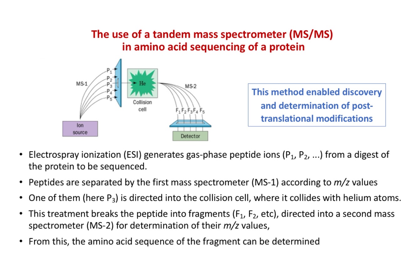 Explain how tandem mass spectrometer (MS/MS) in amino acid sequencing of a protein works.
