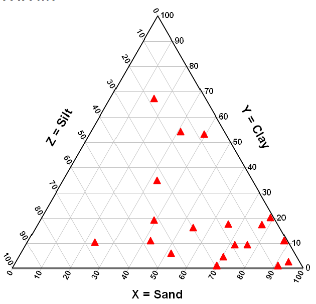 Ein trilinear Scatterplot. Er wird bei multivariaten Visualisierungen angewendet, wenn die Summe der Attributausprägungen je Datenpunkt 1 ergibt.