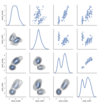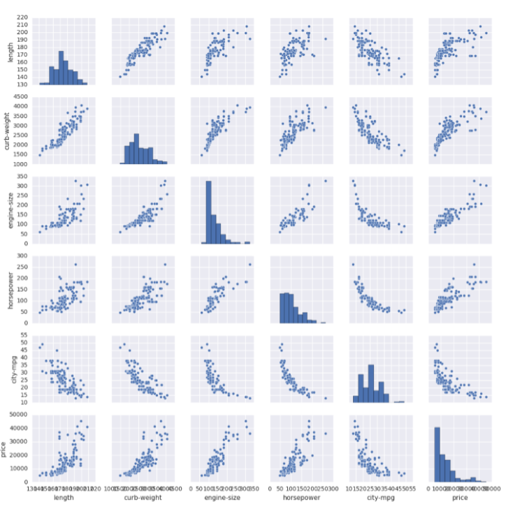 Ein Matrix Scatterplot. Die Diagonale, die normalerweise nicht genutzt wird, wird hier verwendet um die generelle Verteilung des jeweiligen Attributs zu beschreiben.