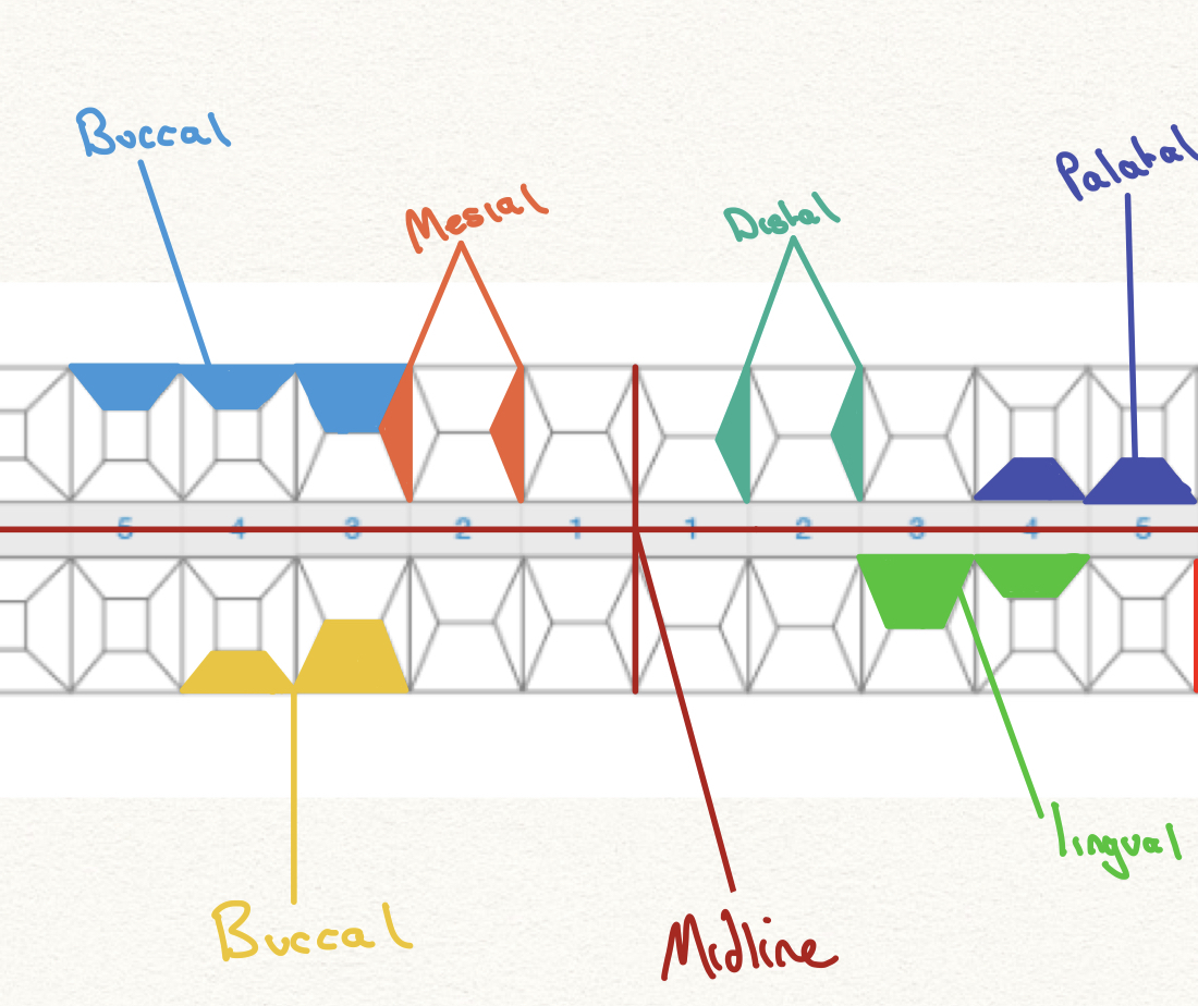 Buccal surfaces are furthest from the horizontal midline.