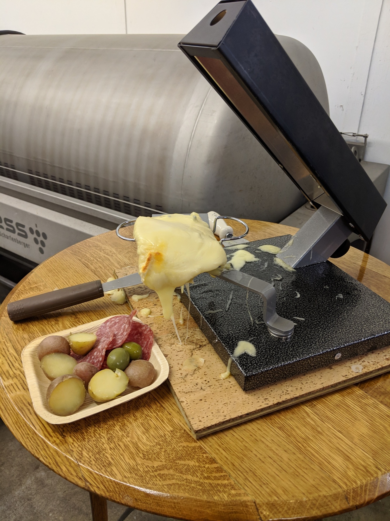 A machine or other device, electrical or coal for heat source, that provides an even source of low heat to melt raclette for scraping and serving.