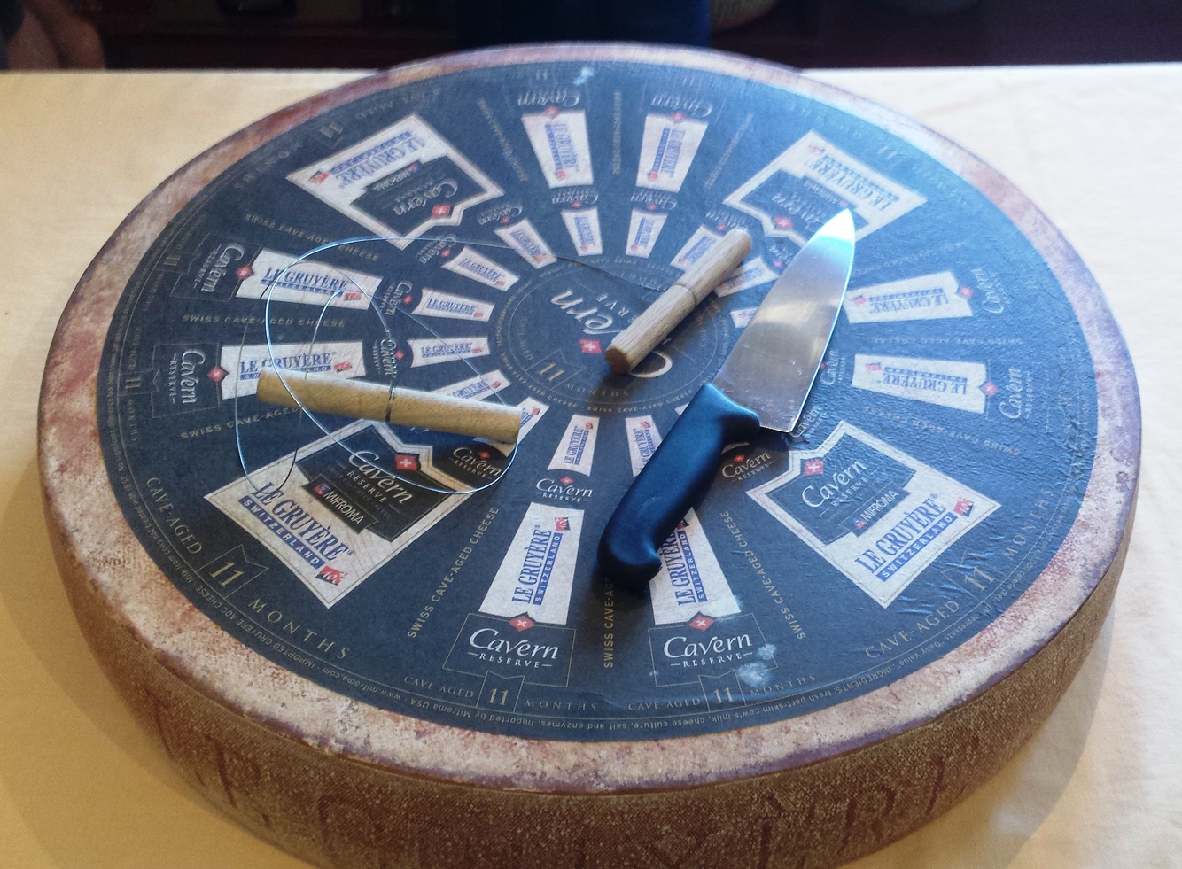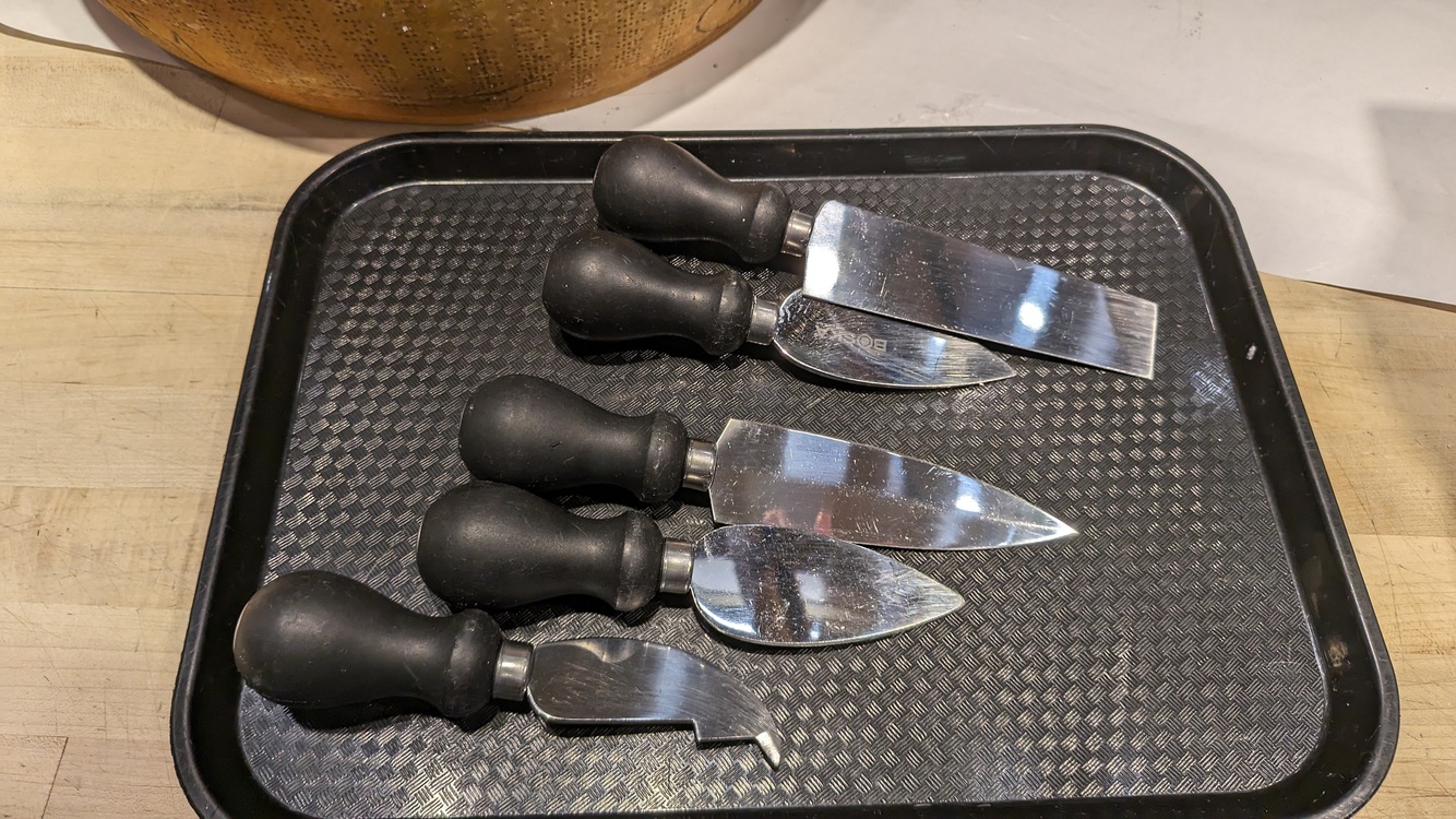 What kind of knife might one use to cut a large semi-firm or hard cheese that has been tempered at room temp for a short time?