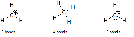 If carbon is only making three bonds, it is a carbocation and has a positive charge (see diagram).