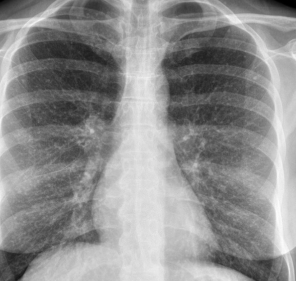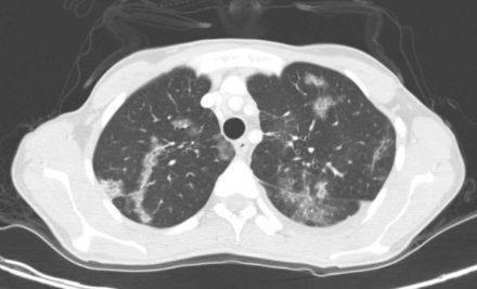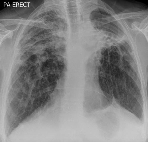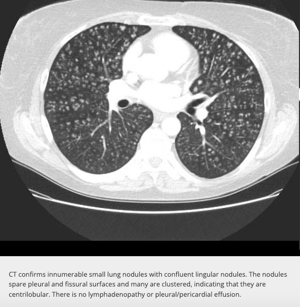Miliary upper lobe nodules - think inhalational coal workers pneumoconiosis or silicosis
