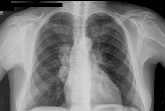 Elevation of the hila due to fibrosis. Coarse interstitial markings