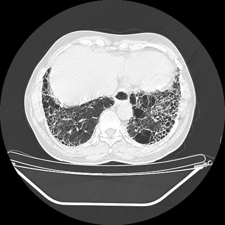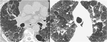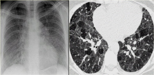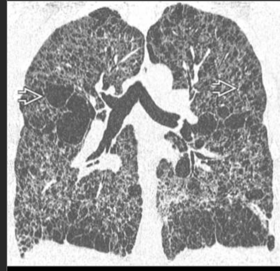 Large thin-walled cysts diffusely distributed in the lungs that will eventually replace the entire lung parenchyma.