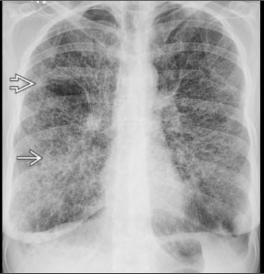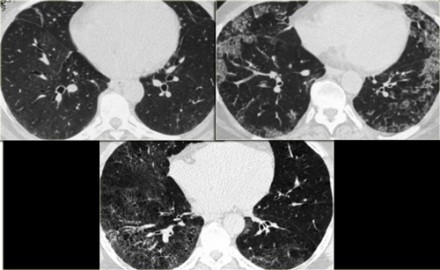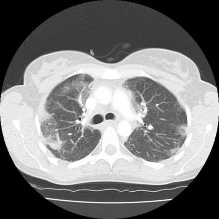 Multifocal peripheral GGO and consolidations (subpleural/peribronchial)
