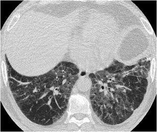 upper lung zone predominant process that features patchy ground-glass opacities and faint centrolobular nodules, as seen in this case. On a spectrum with DIP. Can see RB-ILD within 2 years of starting smoking, and treatment is cessation.