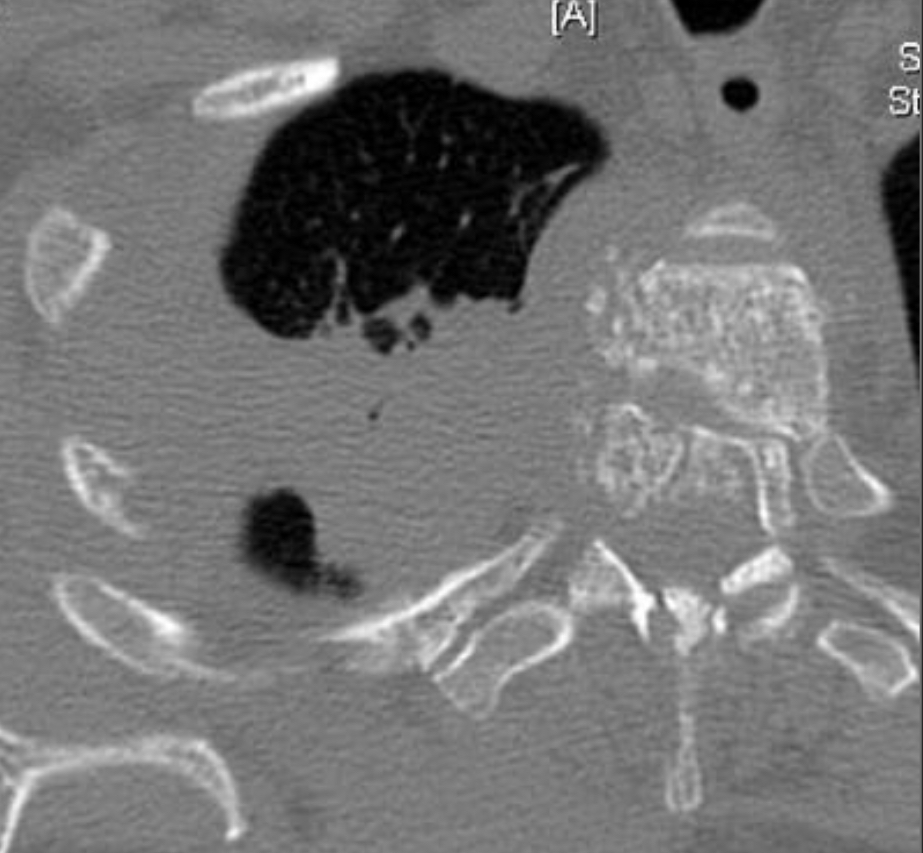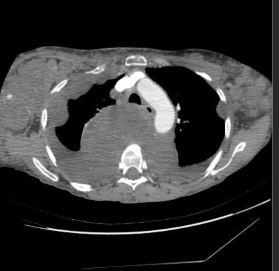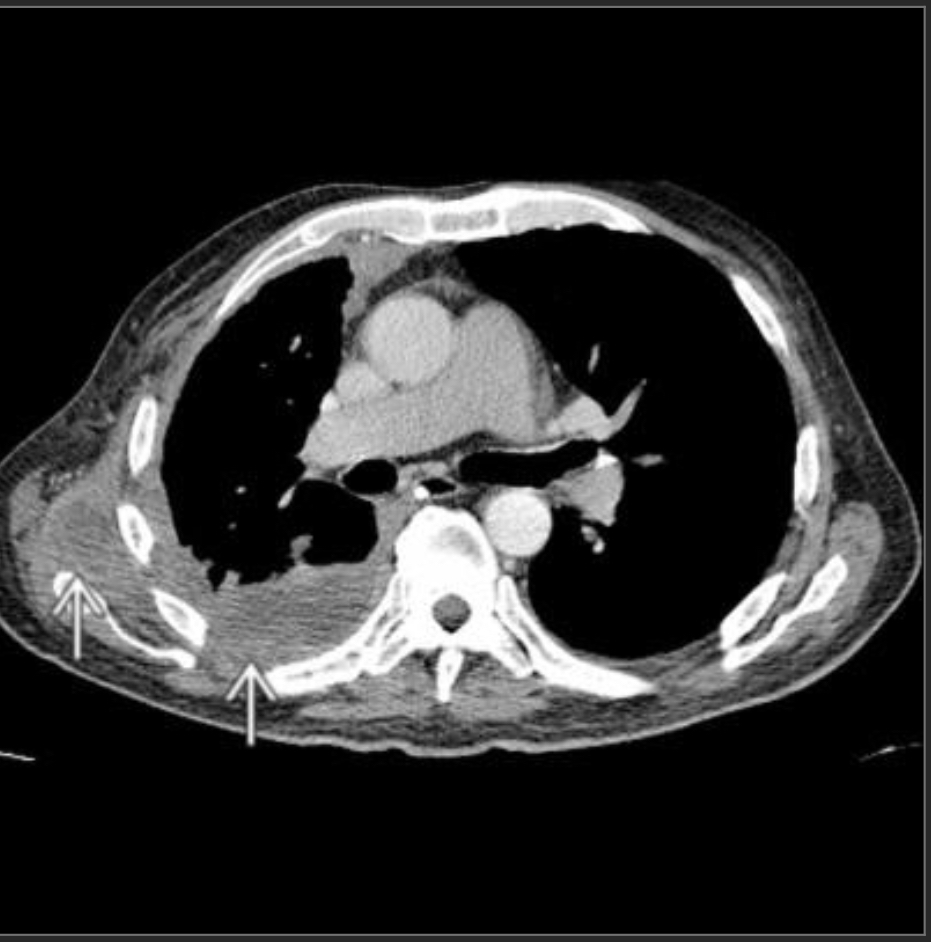 mass-like right upper lobe consolidation with a parapneumonic pleural effusion. Bone window w/permeative destruction of adjacent skeletal structures.
