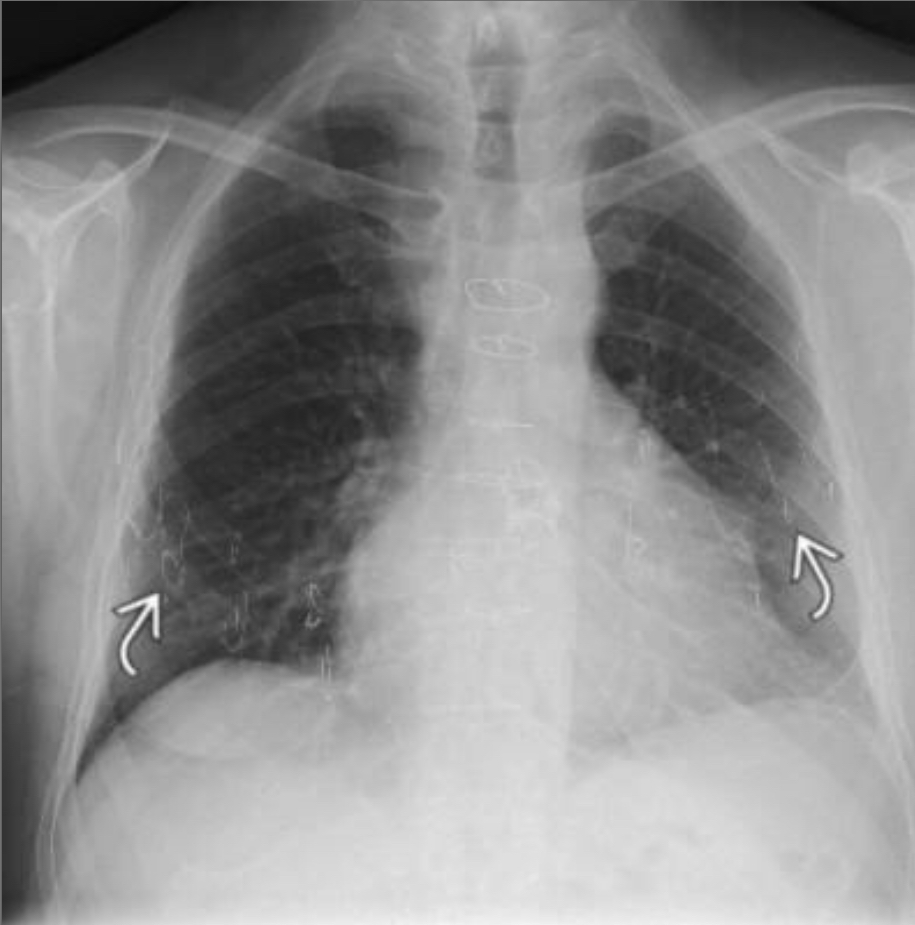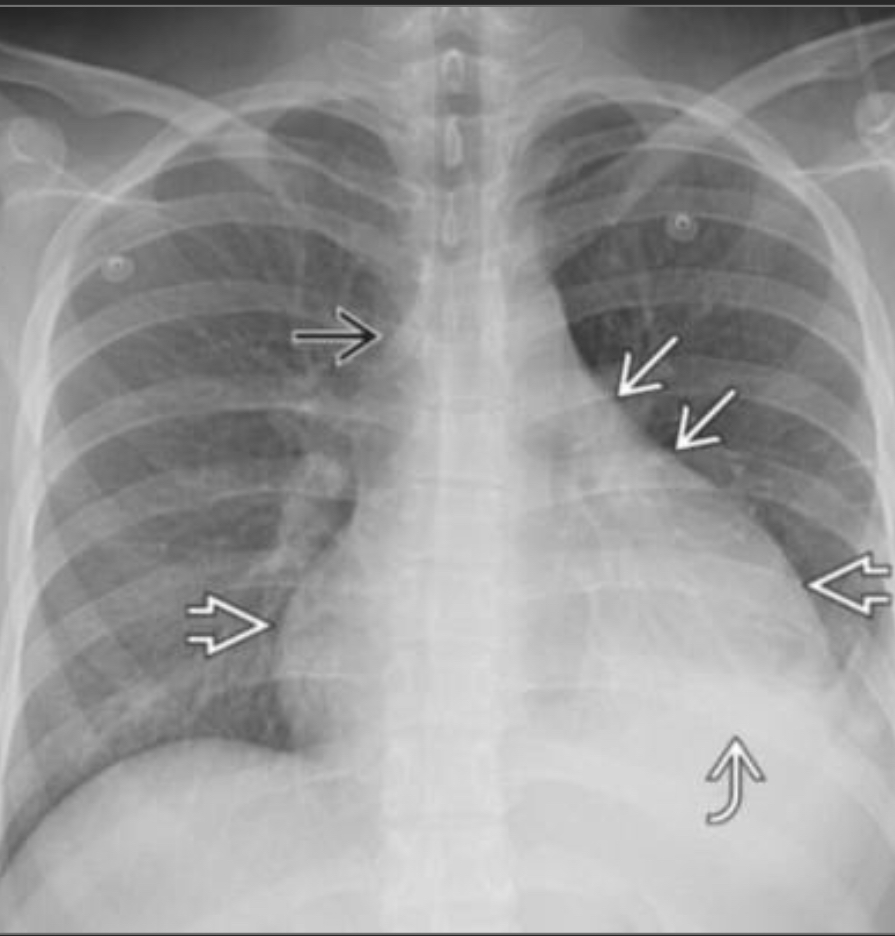 mediastinal interface over the left hilum in the absence of enlargement of the pulmonary arteries should also alert you to possibility of a pericardial effusion (fluid accumulating in a pericardial recess) because an enlarged cardiac chamber, such as the left atrial appendage, will not produce an interface this high along the left cardiac border.