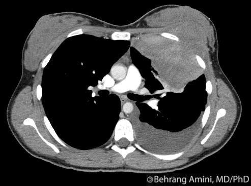 most common thoracic manifestations include neurofibromas in the subcutaneous tissues and mediastinum. In this case, innumerable neurofibromas are present in the axillae , chest wall , and mediastinum . Although not present in this case, other regions of the chest, including the lungs and osseous structures such as the spine and ribs, may be affected.
