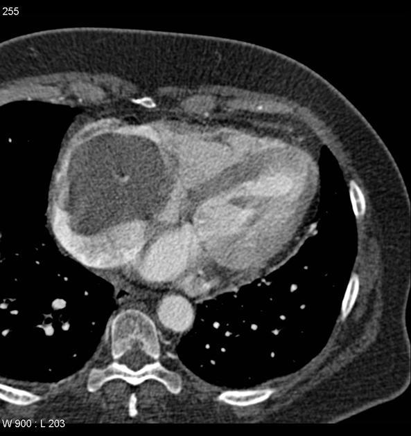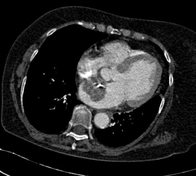 Myxomas, as is the case with other cardiac tumors, appear as intracardiac masses, most often in the left atrium and attached to the interatrial septum. They are usually heterogeneously low attenuating (approximately two-thirds of cases 2,8). Due to repeated episodes of hemorrhage, dystrophic calcification is common 8.