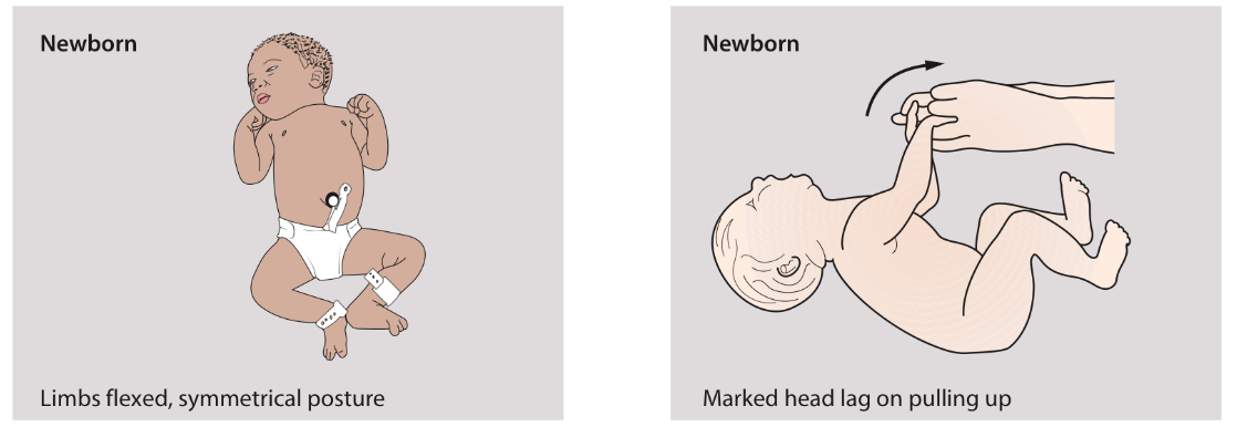 Limbs flexed, symmetrical posture