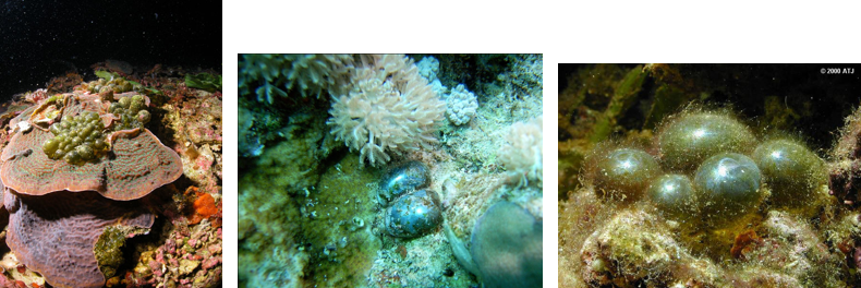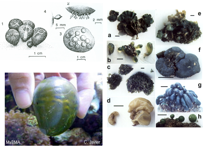 This organism is frequently found on coral reefs, and a thin red alga develops on it.