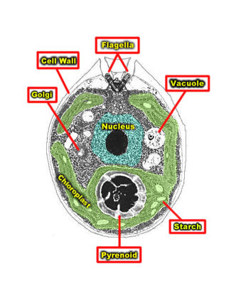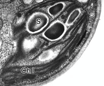 Starch is the storage product of Chlorophyta. It is localized around pyrenoids or distributed in the chloroplast stroma.