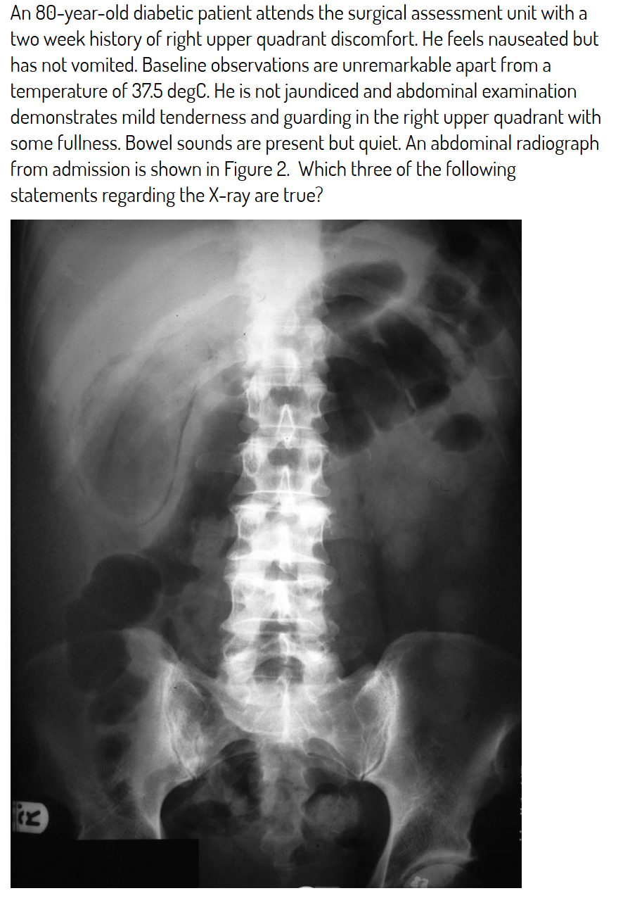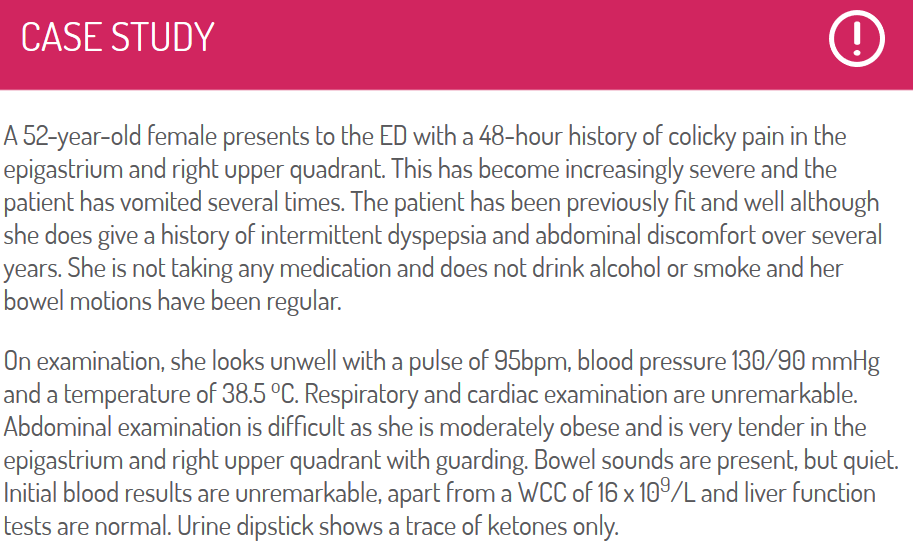 1. Acute cholecystitis, acute pancreatitis and perforated duodenal ulcer. - pyelonephritis can cause fever and abdominal pain (classically loin-to-groin) but would be unlikely with the negative urine dip. Renal colic causes loin-to-groin pain but is likely to cause at least blood on the urine dip and wouldn’t explain her fever and level of illness – also the abdomen would usually be soft