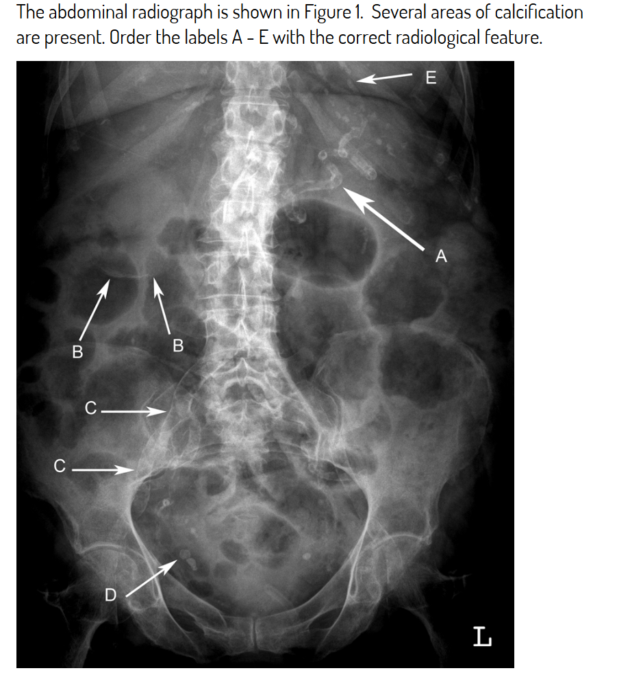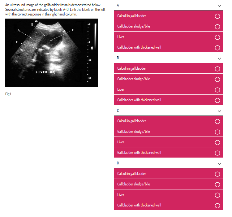 An ultrasound image of the gallbladder fossa is demonstrated below. Several structures are indicated by labels A-D. Link the labels on the left with the correct response in the right hand column.