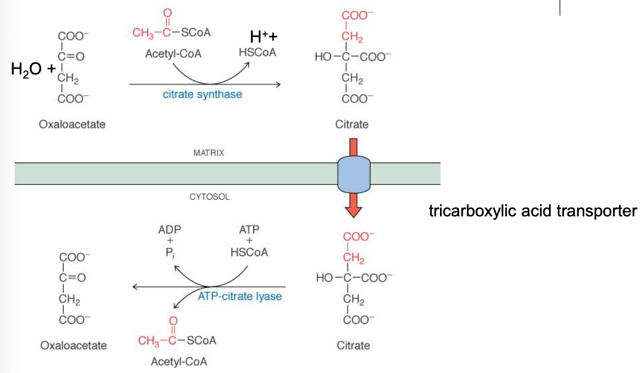 OAA -> citrate -> crosses IMM through citrate transporter (tricarboxylic acid transporter) and OMM through porins -> citrate lyase uses ATP to make acetyl coA and OAA