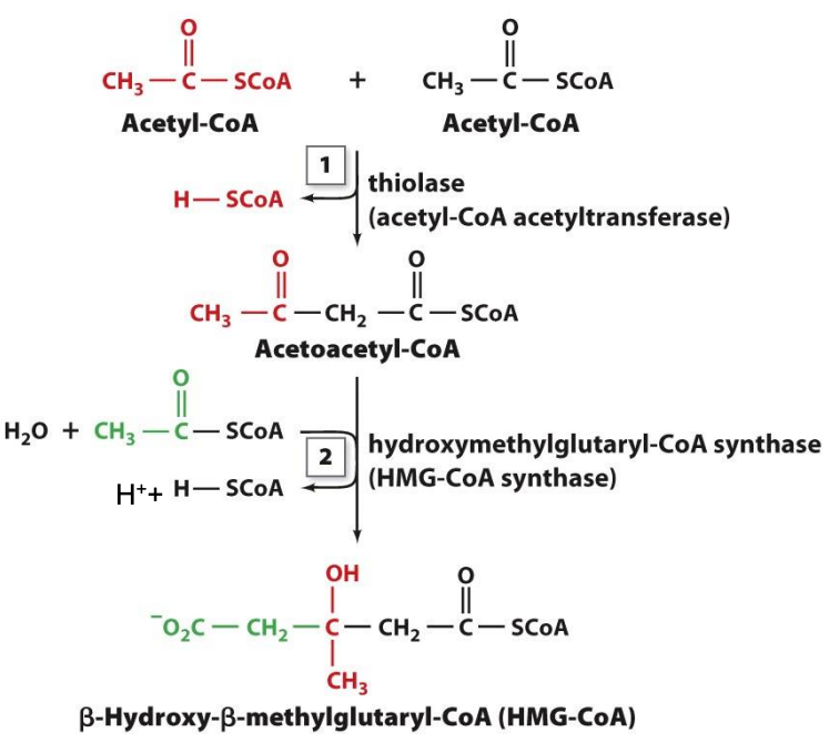 1) linking 2 acetyl coA using a thiolase to generate acetoacetyl-coA (same as ketogenesis)