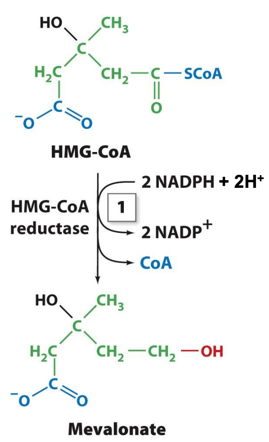 1) conversion of HMG-coA to mevalonate using two NADPH and the HMG-coA reductase