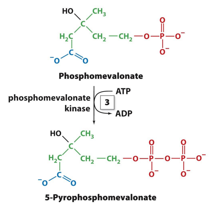 mevalonate kinase transfers phosphate group from ATP to generate phosphomevalonate, which is then converted to isoprene through decarboxylation