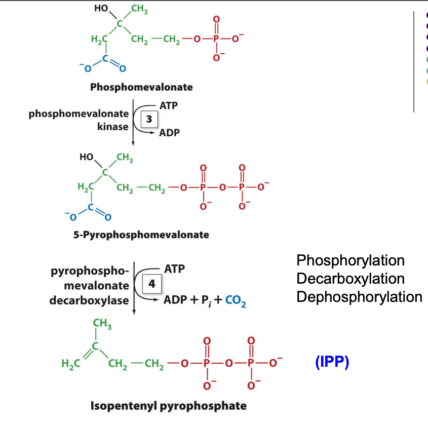 in cholesterol synthesis, what happens to phosphomevalonate? what is used? why is this done?