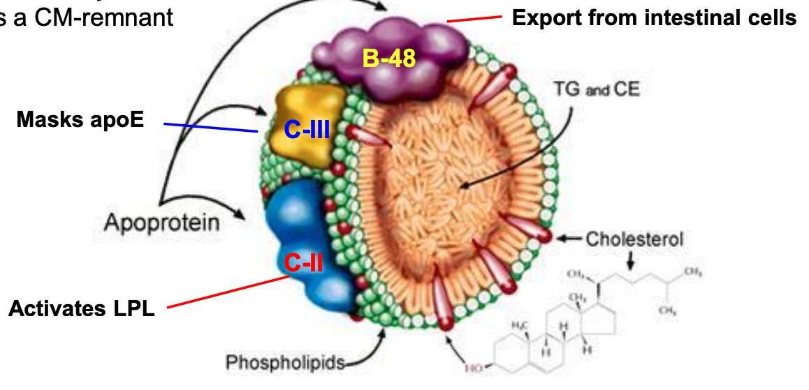 3) C-III: masks ApoE to inhibit uptake of CM into the liver (CIII falls off only after CM is hydrolized)