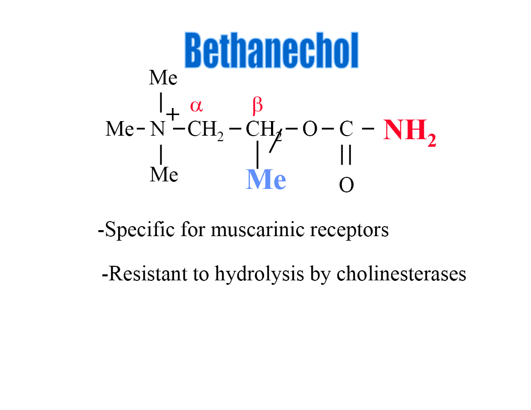 methyl group on beta carbon atom of ACh, making it more resistant to ACh and more specific for muscarinic receptors