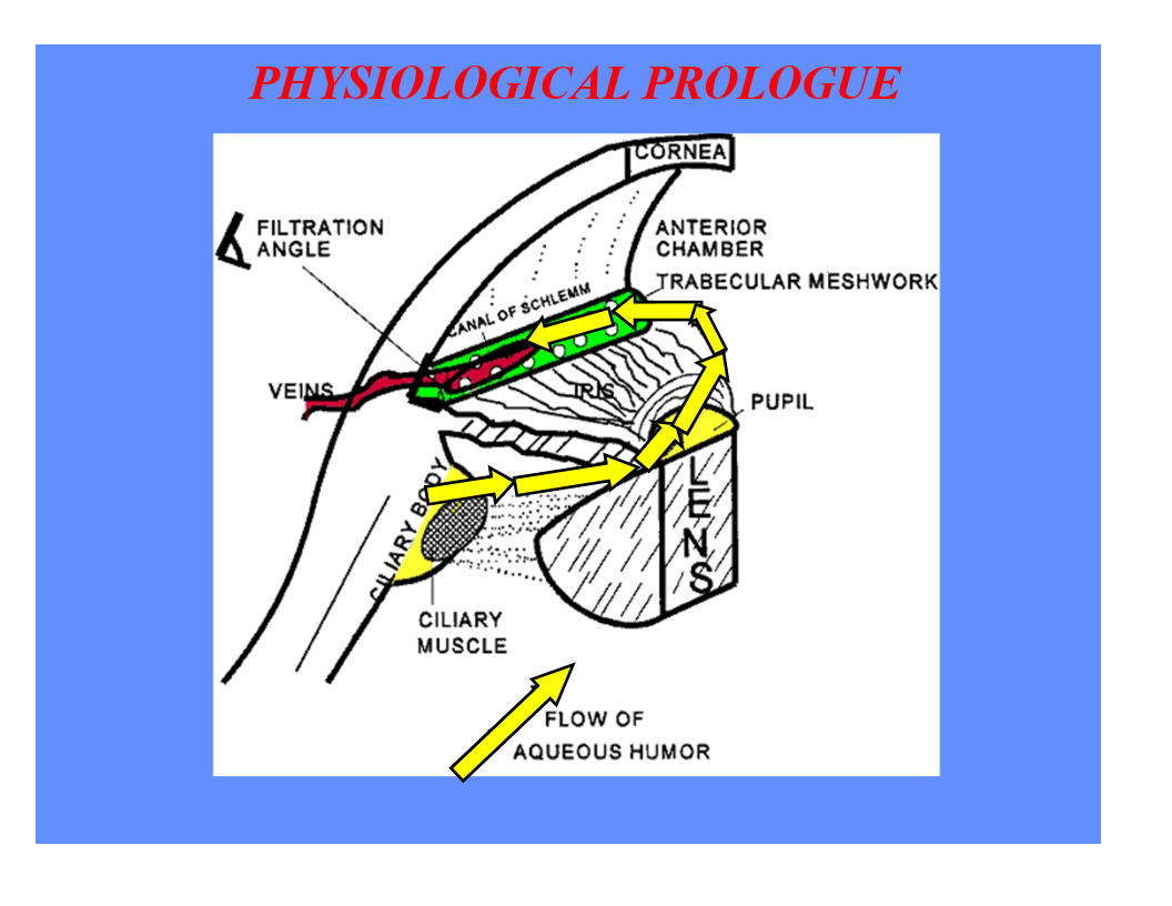 AH synthesis in ciliary body -> AH in anterior chamber -> AH to trabecular meshwork to canal of Schlemm -? AH out of the eye through the venous system