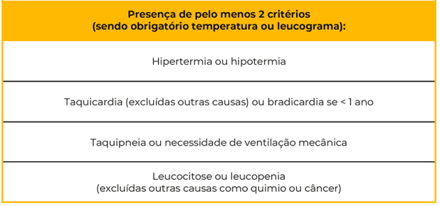 2 ou mais critério de SIRS + infecção OU disfunção cardiovascular ou SDRA ou 2 disfunções orgânicas concomitantes