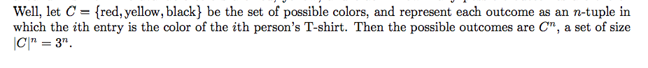 To see an example of this notation, suppose there is a group of n concert-goers, each of whom is selecting a band T-shirt. The available colors are red, yellow, and black. How many possible outcomes are there?
