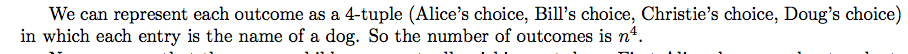 Suppose there are four children—Alice, Bill, Christie, and Doug—at an animal shelter, checking out the current pool of n dogs. Each child writes down the name of the dog he or she likes most. How many possible outcomes are there?