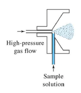 It uses a high-velocity stream of gas to break up a liquid sample into small droplets. This process often aspirates (draws up) the liquid using the Bernoulli effect.