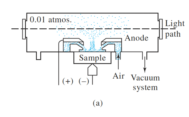 Like for the Hollow cathode lamp, A sputtering process is when an inert atmosphere is created in a chamber, an inert gas is then introduced (often argon). Then a high volatage is applied between the electrodes and ionizing the argon gas: where the cations will migrate to the cathode and the free electrons migrates to the anode.