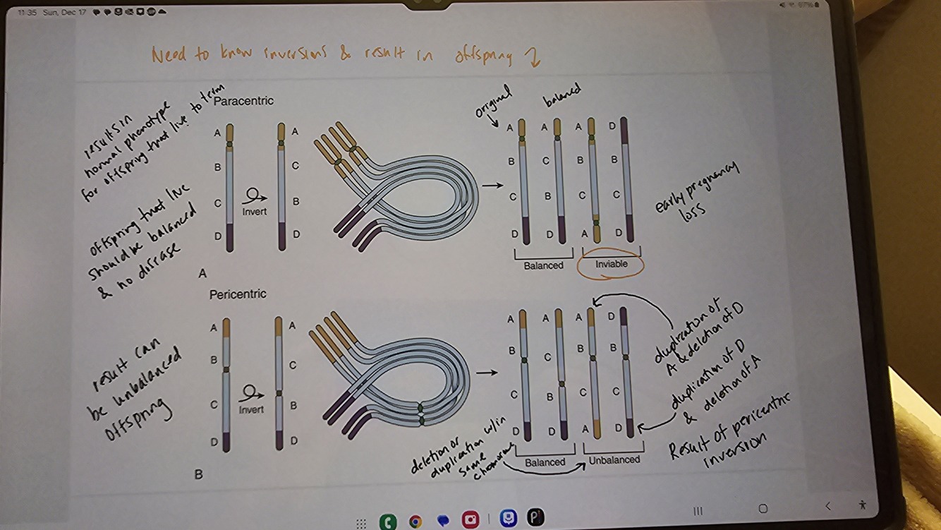 A pericentric inversion involves the centrome. It can lead to production of unbalnd3err$2
