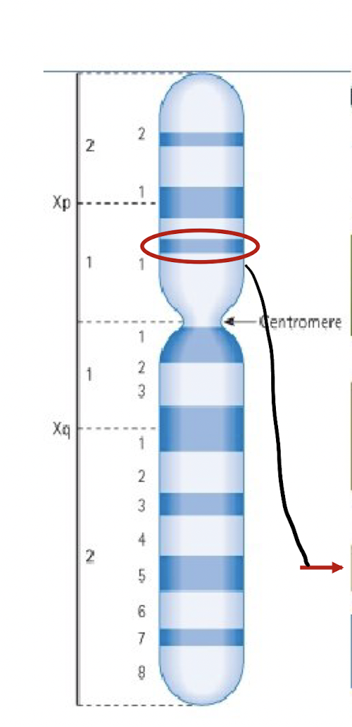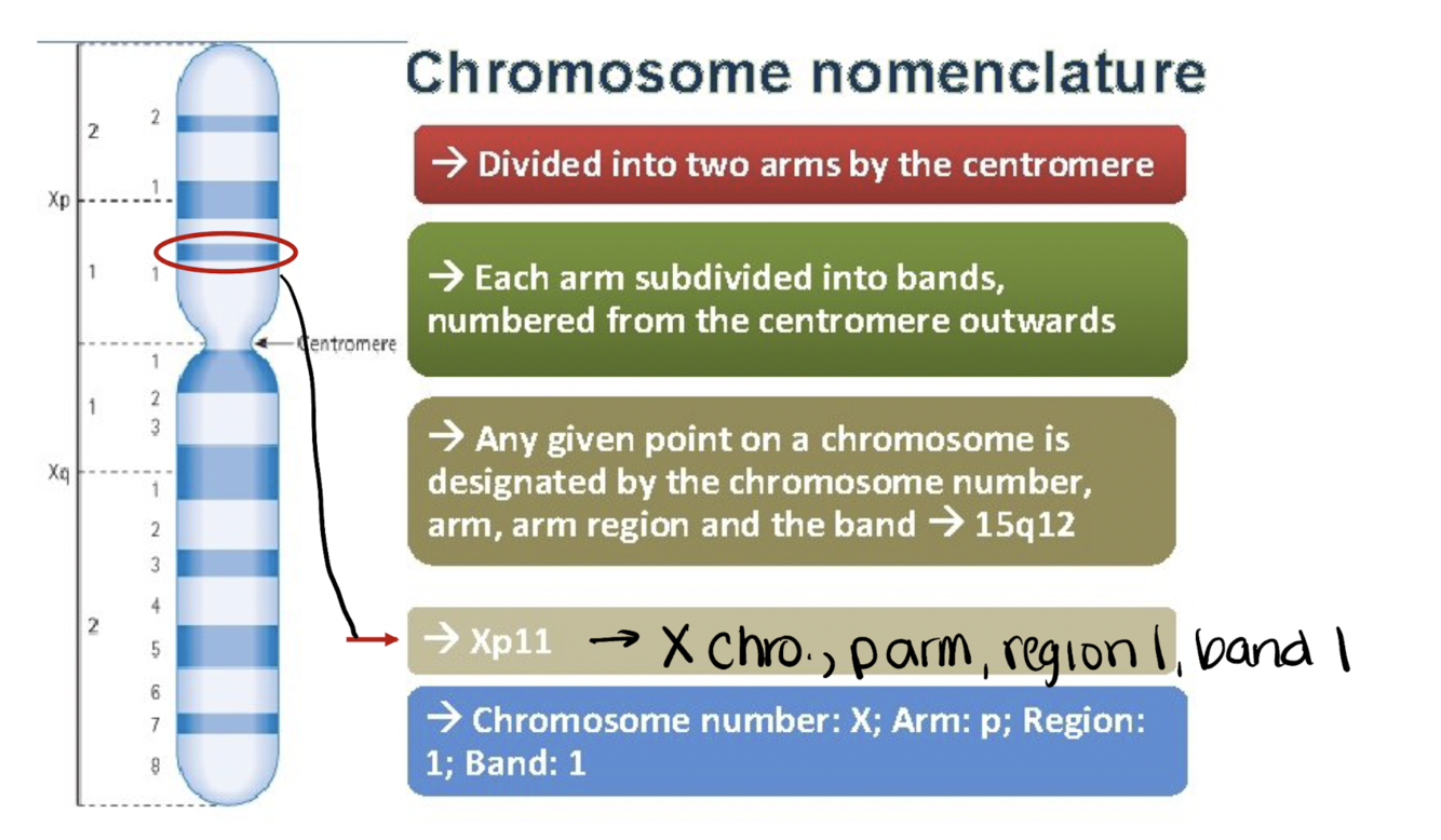 Chromosome loci are named based on chromosome number, arm, region, and band. Identify the circle loci on the chromosome.
