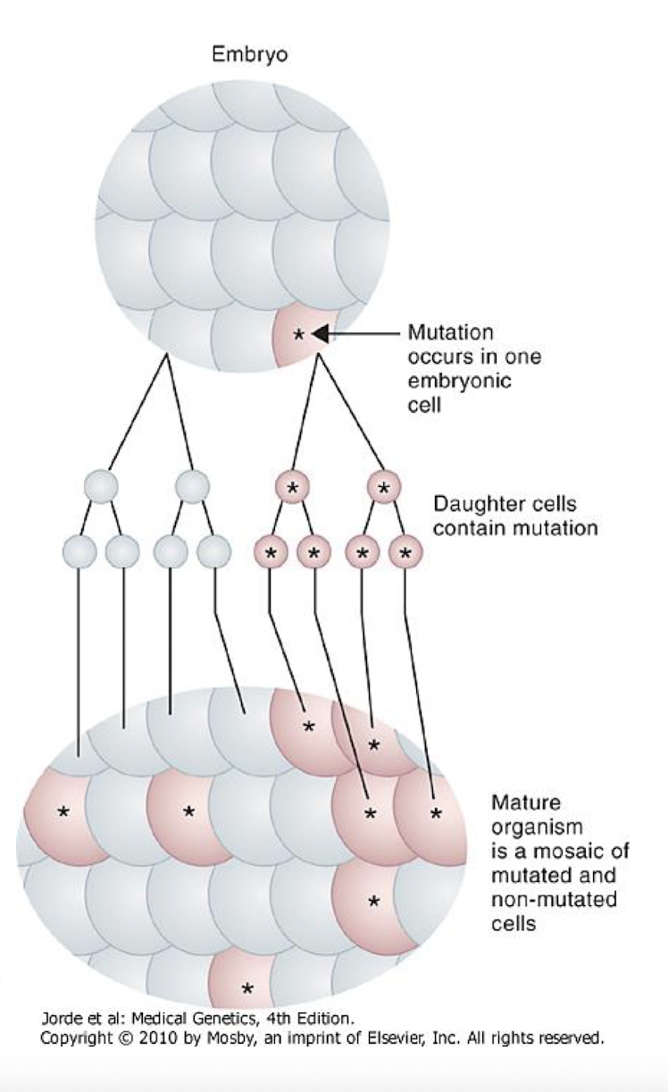 Mosaicism is the concept that cells in the body may sometimes be genetically different than other cells, with different genotypes and phenotypes. The mature organism is a mosaic of mutated and non-mutated cells.
